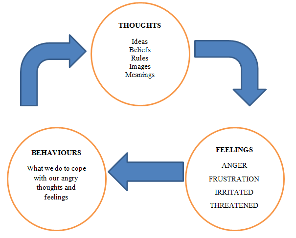 I’d like you to consider this diagram as I discuss how our feeling of anger is influenced by our thoughts and consider thoughts, feelings and behaviour as a full package to anger……if you’re feeling angry; there will be something happening from all 3 components.